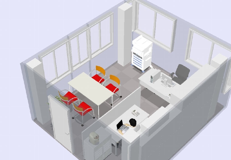 事務所規模:2人/10坪 弊社ご提案・納入備品 DESK:Garare White2シリーズ 収納:Garage KKシリーズ チェア:Garage TCシリーズ OA・通信設備:IPビジネスホンSELAZA、リコーカラー複合機イマジオC2500 「パッケージリースご利用」